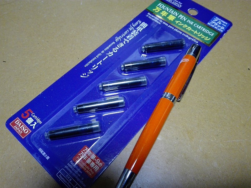 2015年10月10日 DIME万年筆のインク 文房具 0 5月頃に付録目当てで買ったDIMEの万年筆。 結局あんまり使っていないんですが、それでもインクは減るのが万年筆。 オート万年筆のインクが使えそうなのですが、なかなか売っていない。 というか、ブラックは見かけたことありますが、ブルーブラックは見たことがない。 かといって、わざわざ海外メーカーのインクを使うのも高いし。 と思っていたらダイソーで見つけました。 5本で\100、これで十分。 [1回]PR