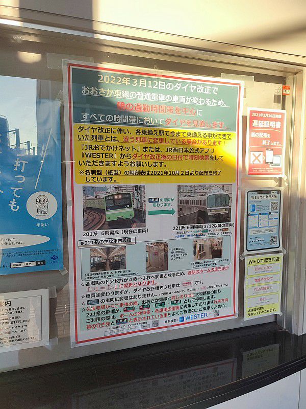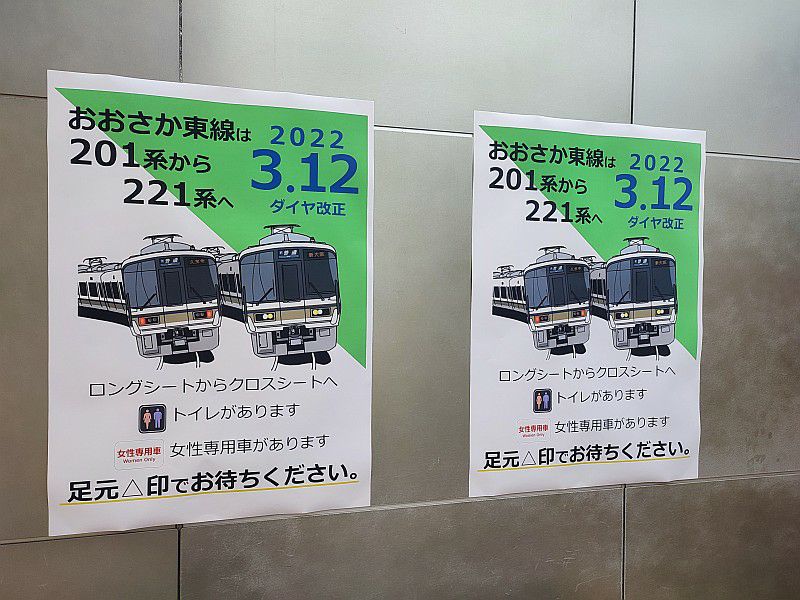 2022年02月25日 おおさか東線201系 鉄道 0 ダイヤ改正まで2週間になって、 おおさか東線の車両変更の案内も見かけるようになりました。 201系が、全部221系に置き換わるっぽい感じですね。 でも直通快速は207系/321系のままのようです。 ここだけ変更しないのは、運用上のなにか意味があるのかな。 新大阪駅でも221系をアピールするポスターがありました。 これだけ見たら、新車に置き換わりそうな印象ですね(笑) 毎朝見かけるオーシャンアローと201系の並びです。 くろしお6号も到着時刻が少し変わるようなので、毎朝見かけることもなくなりそう。 [0回]PR