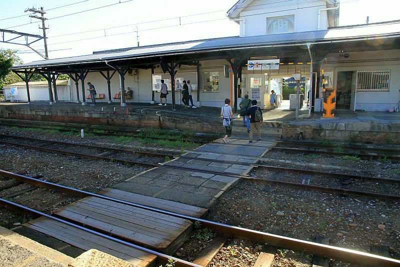 高宮駅は、ホームから下りる構内踏切もある変わった構造の駅です。