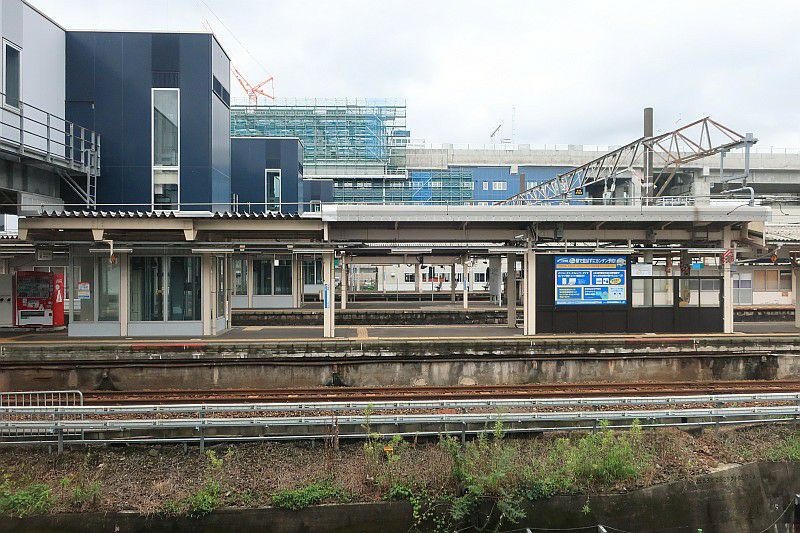 在来線ホームの雰囲気は昔のままですが、昔はなかった跨線橋と、奥には新幹線の工事中。