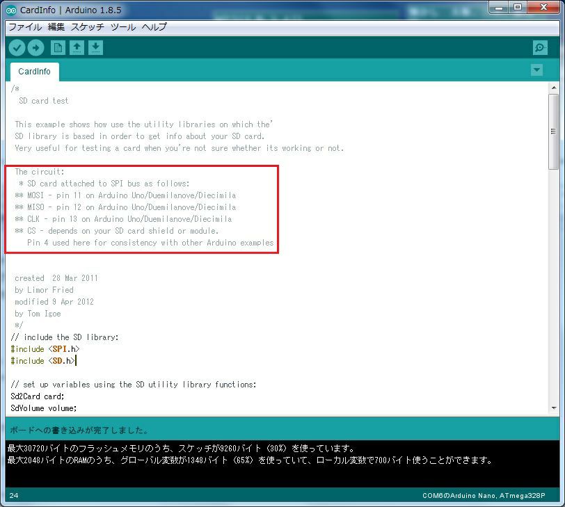 SD→CardInfoのサンプルスケッチを開いて、赤枠部分を参考にブレッドボードで結線です。