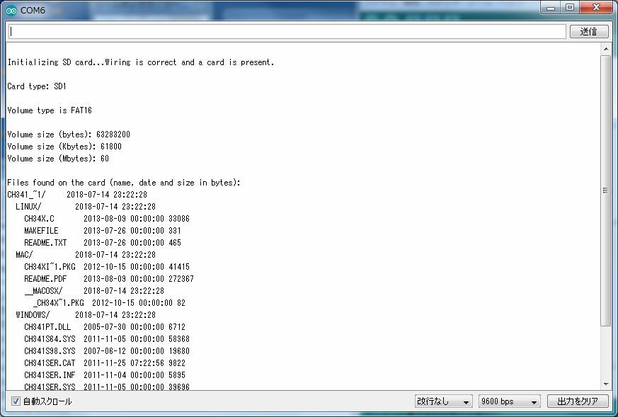 SDカードの容量と、ファイルリストがシリアルモニタに出力されました。