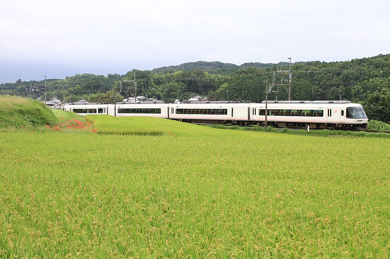 稲刈り前の田んぼの脇を走るさくらライナー。