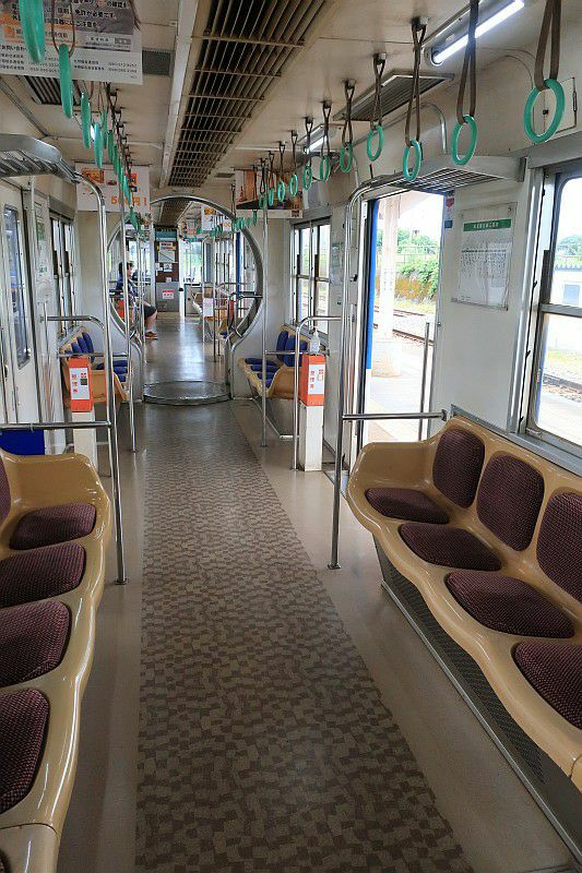 駅のベンチのようなシートが並ぶ、レトロな車内。