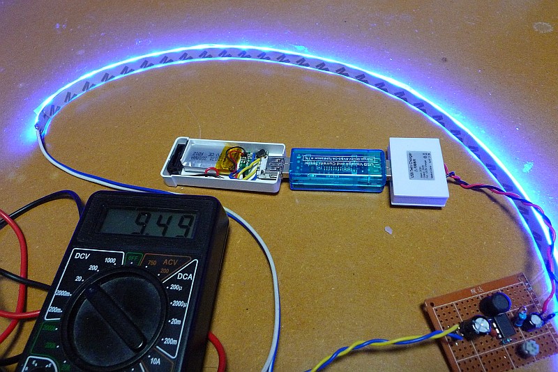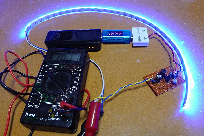 USBモバイルバッテリーで、12V用LEDを光らせてみたところ。