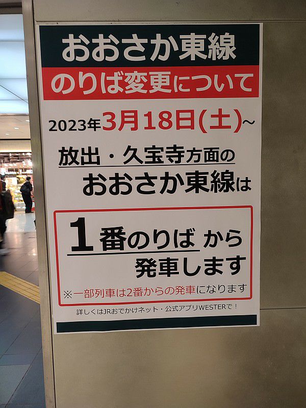 おおさか東線の普通列車は2番線から1番線に変わるようです。