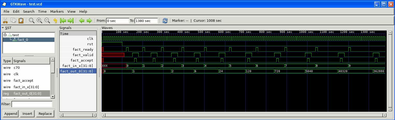 module test();//localparamslocalparam CLK_PERIOD = 10;localparam CLK_HALF_PERIOD = 5;localparam INITIAL_RESET_SPAN = 100;localparam test_b1_INIT = 0;localparam test_b1_S1 = 1;localparam test_forelse5_S0 = 2;localparam test_forelse5_FINISH = 3;localparam test_L1_fortest2_S0 = 4;localparam test_L1_forbody3_S0 = 5;localparam test_L1_forbody3_S1 = 6;localparam test_L1_forbody3_S2 = 7;localparam test_L1_forbody3_S3 = 8;localparam test_L1_forbody3_S4 = 9;localparam test_L1_forbody3_S5 = 10;localparam test_L1_forbody3_S6 = 11;localparam test_L1_forbody3_S7 = 12;//signals:wire c69;wire fact_0_valid;reg clk;reg fact_0_accept;reg fact_0_ready;reg rst;reg [3:0] test_state;reg signed [31:0] i2;reg signed [31:0] i3;//signals: in_xreg [31:0] fact_0_in_x;//signals: out_0wire [31:0] fact_0_out_0;//combinations:assign c69 = (i2 < 10);//sub modules//fact_0 instancefact fact_0(.clk(clk),.rst(rst),.fact_ready(fact_0_ready),.fact_accept(fact_0_accept),.fact_valid(fact_0_valid),.fact_in_x(fact_0_in_x),.fact_out_0(fact_0_out_0));initial begin$monitor("%5t:fact_0_in_x=%4d, fact_0_out_0=%4d", $time, fact_0_in_x, fact_0_out_0);$dumpfile("test.vcd");$dumpvars(0, test);endinitial beginclk = 0;#CLK_HALF_PERIODforever #CLK_HALF_PERIOD clk = ~clk;endinitial beginrst <= 1;#INITIAL_RESET_SPANrst <= 0;endalways @(posedge clk) beginif (rst) beginfact_0_accept <= 0;fact_0_ready <= 0;i2 <= 0;i3 <= 0;test_state <= test_b1_INIT;end else begin //if (rst)case(test_state)test_b1_INIT: begini2 <= 0;test_state <= test_L1_fortest2_S0;endtest_forelse5_FINISH: begin$display("%5t:finish", $time);$finish();endtest_L1_fortest2_S0: begin/* c69 <= (i2 < 10); */if (c69) beginfact_0_ready <= 1;fact_0_in_x <= i2;test_state <= test_L1_forbody3_S1;end else begintest_state <= test_forelse5_FINISH;endendtest_L1_forbody3_S1: beginfact_0_ready <= 0;test_state <= test_L1_forbody3_S2;endtest_L1_forbody3_S2: beginif (fact_0_valid == 1) beginfact_0_accept <= 1;test_state <= test_L1_forbody3_S4;endendtest_L1_forbody3_S4: beginfact_0_accept <= 0;test_state <= test_L1_forbody3_S5;endtest_L1_forbody3_S5: begini3 <= (i2 + 1);test_state <= test_L1_forbody3_S6;endtest_L1_forbody3_S6: begini2 <= i3;test_state <= test_L1_fortest2_S0;endendcaseendendendmodule