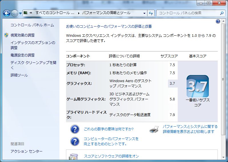 Windows7のエクスペリエンスもグラフィックだけ極端に低いし(笑)