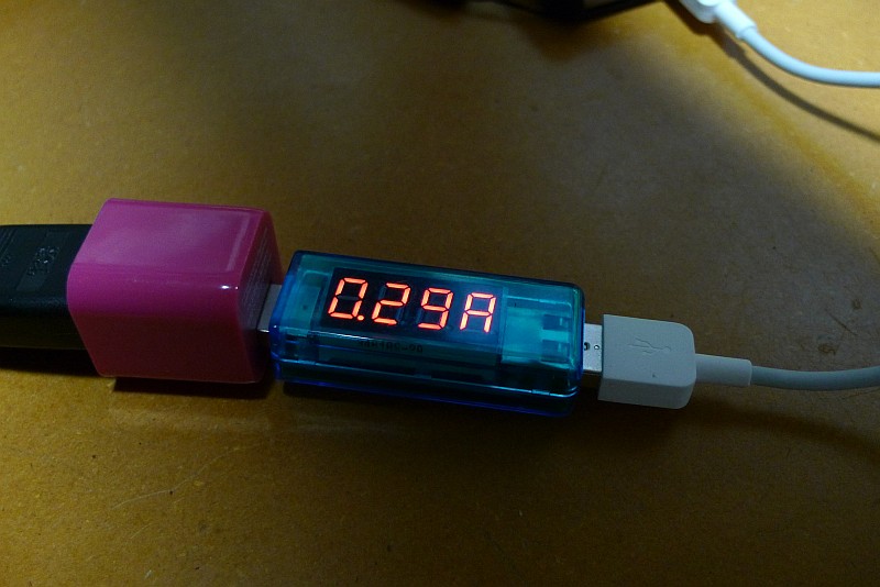 ダイソーの充電器に交換したら、0.3Aぐらいまで落ちました。